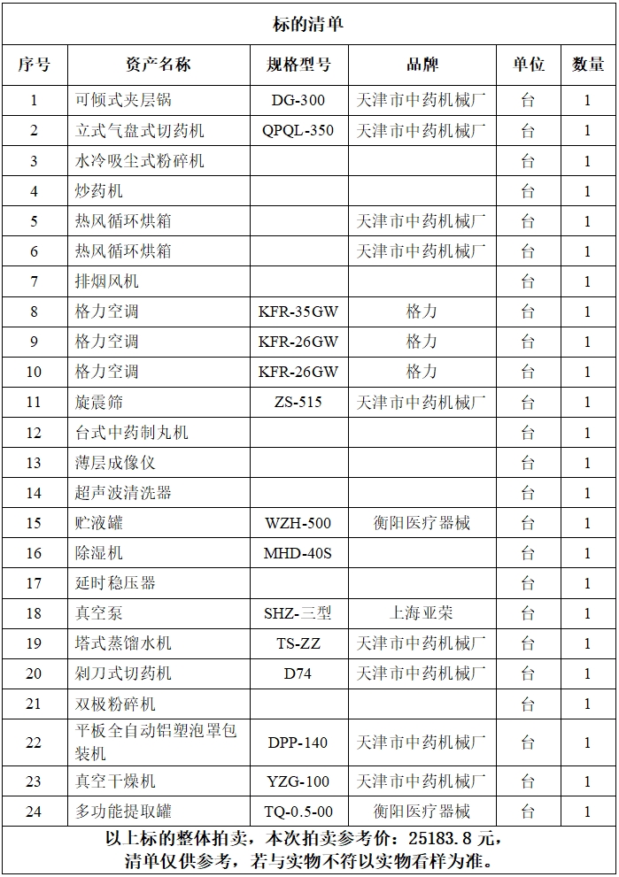 一、拍賣標的:六安市中醫(yī)院制劑室報廢設備一批,包括組合空調(diào)箱、真空干燥機、平板全自動鋁塑泡罩包裝機、風冷模板等,參考價:25183.8元,競買保證金:5000元。