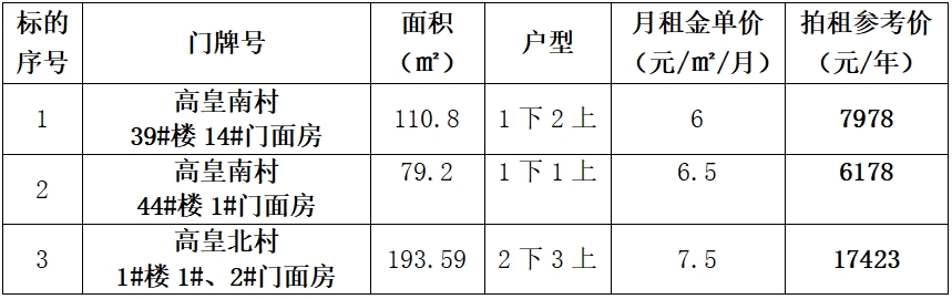 一、拍租標(biāo)的:六安市裕安區(qū)平橋工業(yè)園高皇南、北村安置小區(qū)部分門面房3年期租賃經(jīng)營權(quán),標(biāo)的詳情見下表:
