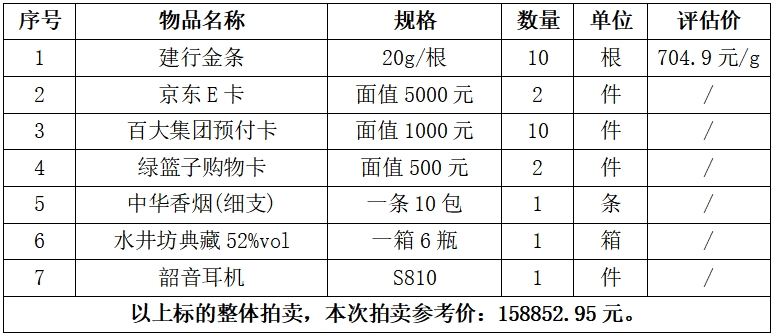 一、拍賣標的:金條、購物卡等物品一批。整體拍賣,參考價:158852.95元,競買保證金:2萬元。(金條價格:704.9元/g)。