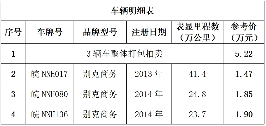 一、拍賣標(biāo)的:皖NNH017別克商務(wù)、皖NNH080別克商務(wù)、皖NNH136別克商務(wù)等3輛二手車,優(yōu)先整體打包拍賣,參考價(jià):5.22萬(wàn)元,整體拍賣不成,再分拆單個(gè)標(biāo)的進(jìn)行拍賣。拍賣標(biāo)的詳情見下表: