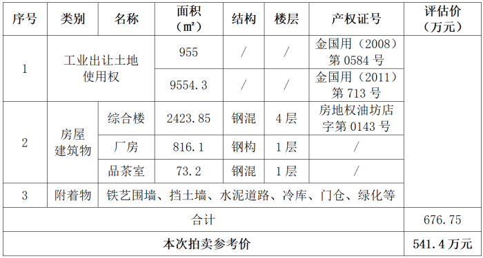 以上標(biāo)的整體拍賣,參考價(jià):541.4萬元,競(jìng)買保證金:50萬元。