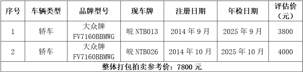 一、拍賣標(biāo)的:皖NTB013、皖NTB026大眾捷達(dá)等兩輛二手車整體打包拍賣,參考價(jià):7800元,競買保證金:5000元。標(biāo)的詳情見下表: