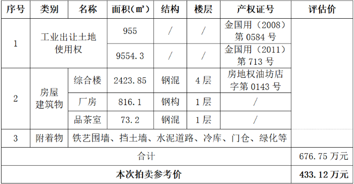 一、拍賣標的:六安市金寨縣油坊店鄉(xiāng)朱堂村“安徽齊山六安瓜片股份有限公司”工業(yè)用地及房屋建筑物、附著物等,包括