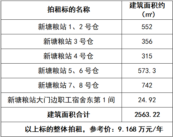 一、拍租標(biāo)的:六安市金安糧食購銷有限公司新塘糧站1-8號倉及糧站大門邊職工宿舍東第1間房屋3年期租賃經(jīng)營權(quán),整體拍租,建筑面積約:2563.22 ㎡,參考價(jià):9.168萬元/年。標(biāo)的詳情見下表: