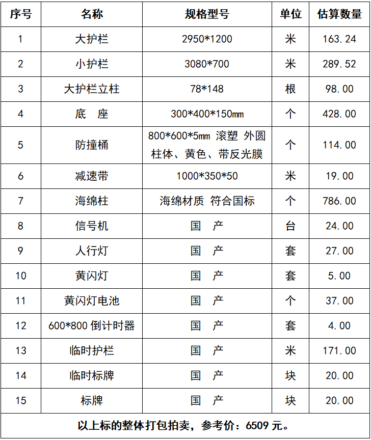 一、拍賣標(biāo)的:廢舊物資一批,包括護(hù)欄、防撞桶、黃閃燈電池等,參考價(jià):6509元。