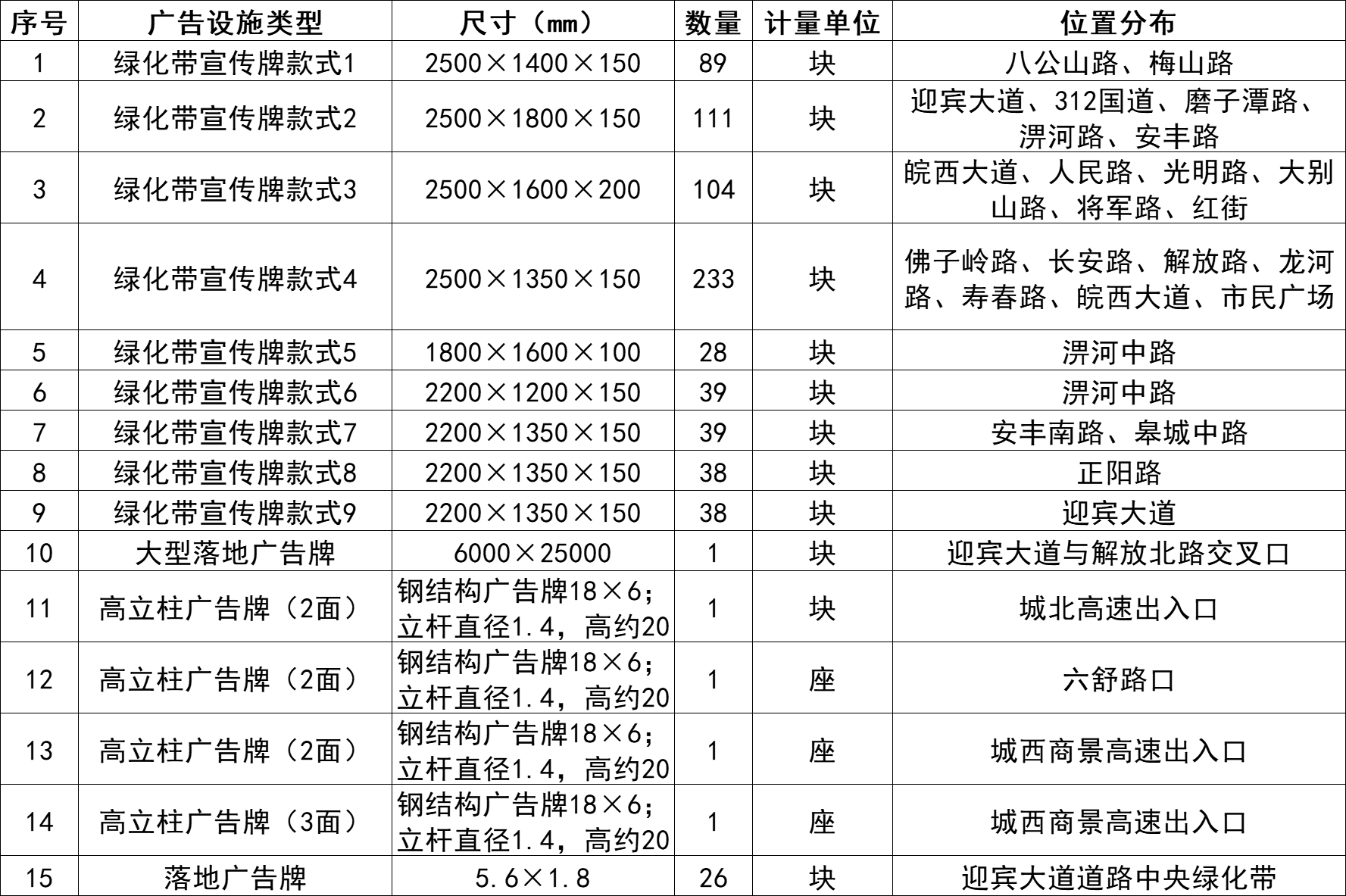 六安城區(qū)750塊戶外廣告牌5年期經(jīng)營權(quán),包括:綠化帶廣告牌719塊、大型落地廣告牌1塊、高立柱廣告牌4塊、落地廣告牌26塊。以上標(biāo)的整體按5年期經(jīng)營權(quán)總價(jià)拍賣,5年期總參考價(jià):277.78萬元,競(jìng)買保證金:20萬元。