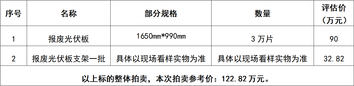 一、拍賣(mài)標(biāo)的:報(bào)廢光伏板3萬(wàn)片及報(bào)廢光伏板支架一批(具體以現(xiàn)場(chǎng)看樣實(shí)物為準(zhǔn)),整體拍賣(mài),參考價(jià):122.82萬(wàn)元。競(jìng)買(mǎi)保證金:15萬(wàn)元。