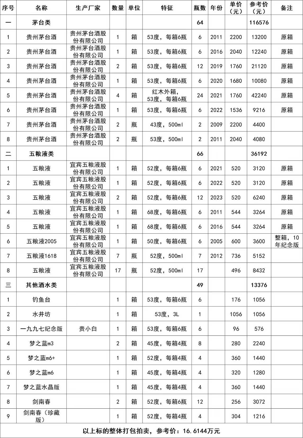 1、貴州茅臺(tái)酒計(jì)64瓶、五糧液酒計(jì)66瓶及其他類(lèi)酒水計(jì)49瓶,整體打包拍賣(mài),參考價(jià):16.6144萬(wàn)元,競(jìng)買(mǎi)保證金:2萬(wàn)元。標(biāo)的詳情見(jiàn)下方清單: