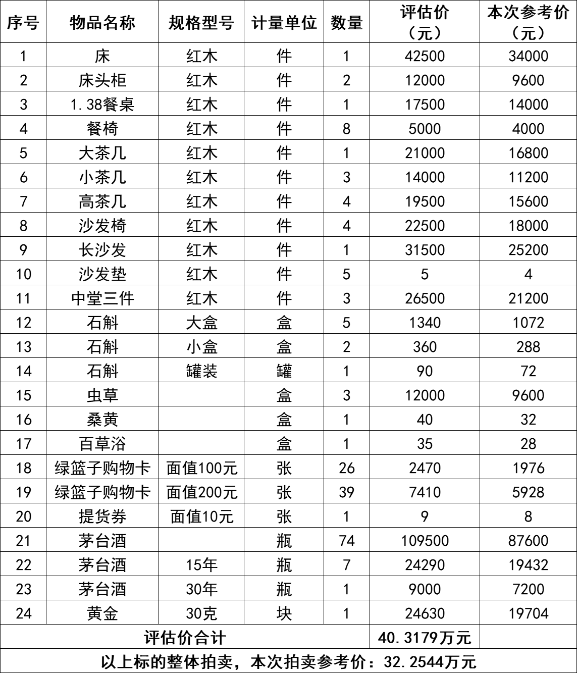 一、拍賣標(biāo)的:茅臺(tái)酒、黃金、紅木家具等物品一批,整體打包拍賣,參考價(jià):32.2544萬(wàn)元。競(jìng)買保證金:6萬(wàn)元。詳見下方明細(xì)表: