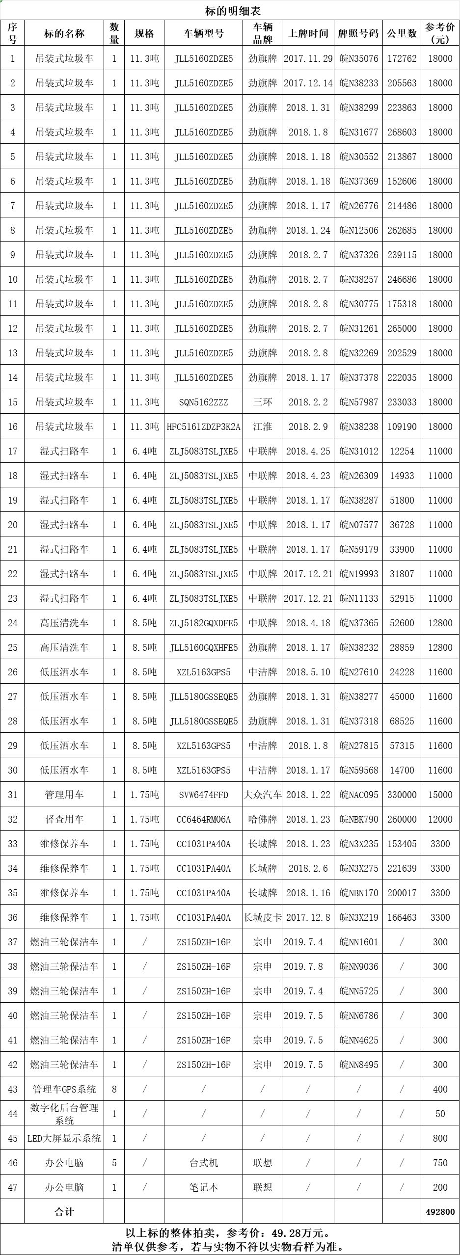 吊裝式垃圾車16輛、濕式掃路車7輛、高壓清洗車2輛、低壓灑水車5輛、管理用車1輛、督查用車1輛、維修保養(yǎng)車4輛、燃油三輪保潔車6輛、辦公電腦6臺以及管理車GPS系統(tǒng)等整體拍賣,拍賣參考價:49.28萬元。