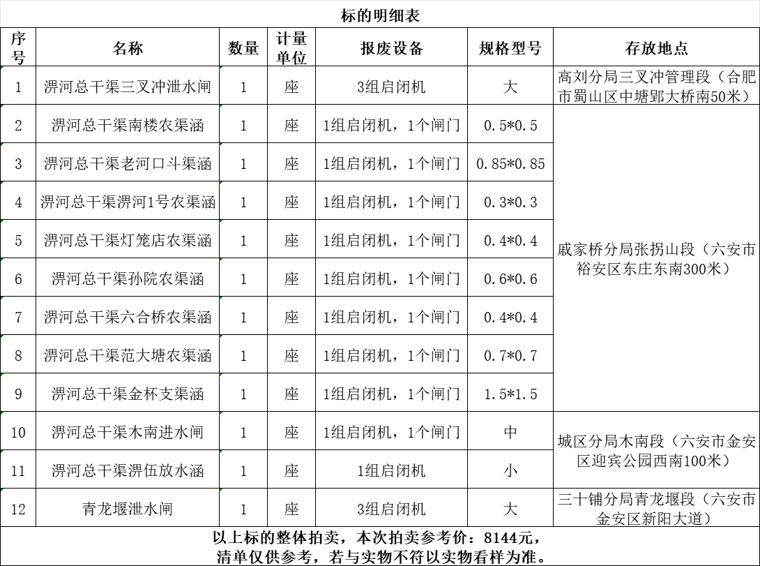 一、拍賣標(biāo)的:報(bào)廢水利基礎(chǔ)設(shè)施設(shè)備一批,參考價(jià):8144元。