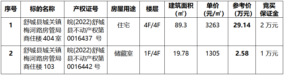 一、拍賣標的:舒城縣城關(guān)鎮(zhèn)梅河路房管局商住樓404室住宅房及103儲藏室,拍賣標的詳情見下表: