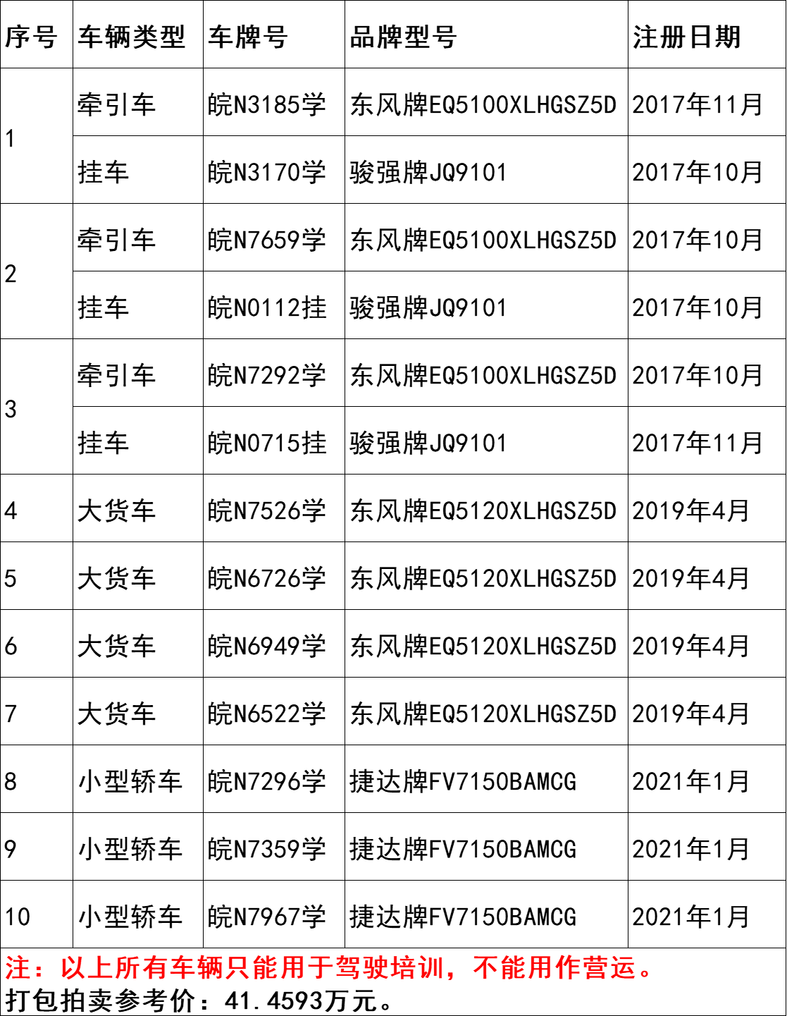 3、皖N3185學(xué)/皖N3170學(xué)牽引掛車、皖N7526學(xué)東風(fēng)牌大貨車、皖N7296學(xué)捷達(dá)牌小型轎車等10輛二手車,打包拍賣。參考價:41.4593萬元,競買保證金:5萬元。標(biāo)的詳情見下表:
