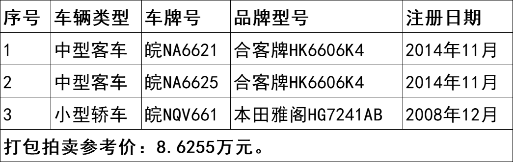 2、皖NA6621合客牌中型客車、皖NA6625合客牌中型客車、皖NQV661本田雅閣小型轎車等3輛二手車,打包拍賣。參考價:8.6255萬元,競買保證金:1萬元。標(biāo)的詳情見下表: